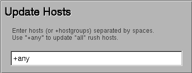 You can have files distribute to all the rush machines (default), or specify individual hosts or +hostgroups. Which machines get the updates is dependent on the contents of the 'Update Hosts' prompt, i.e.: