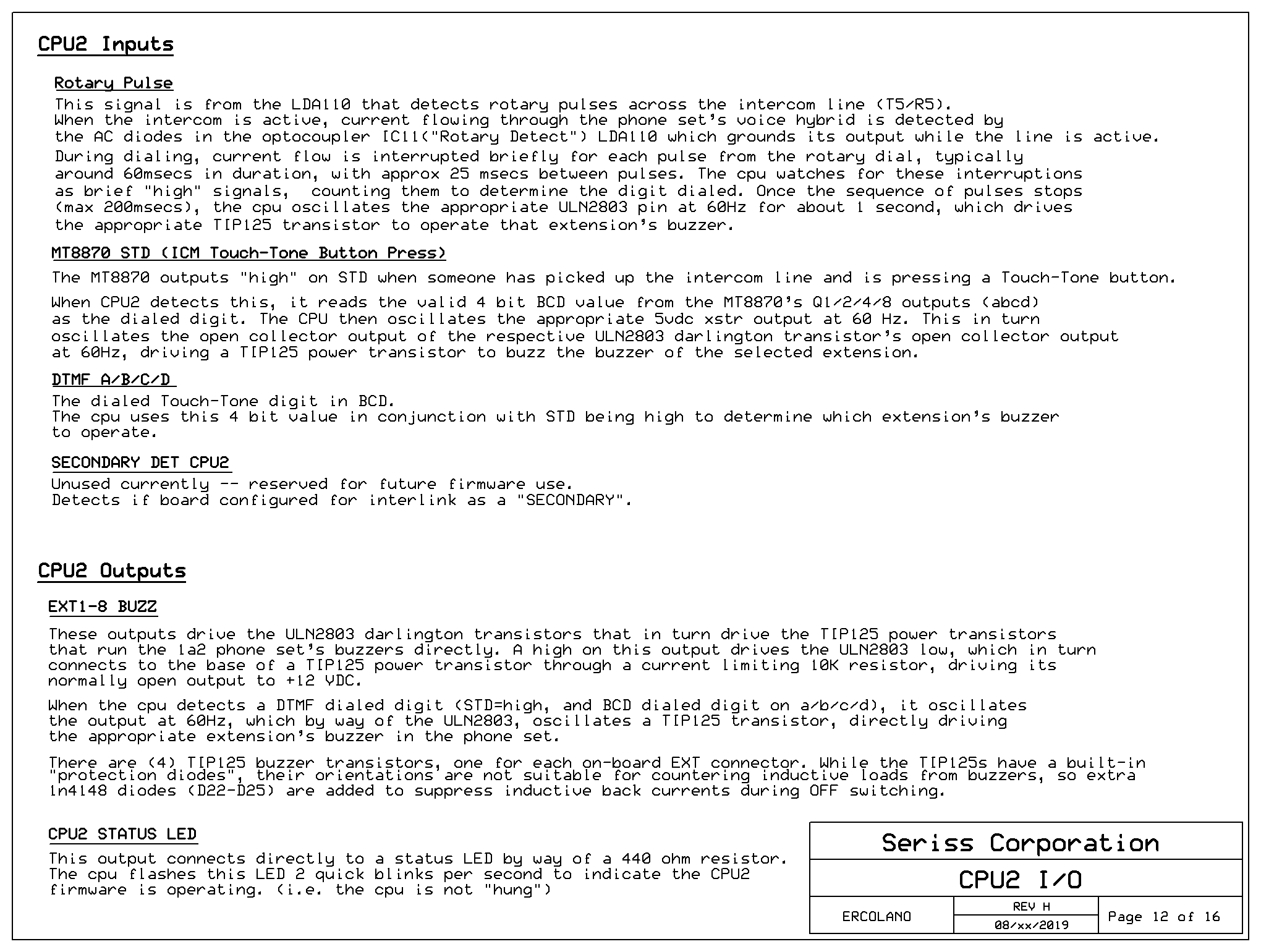 The other PIC chip, CPU2 (IC10), handles the intercom features only (Line #5), including parsing rotary dialing, assists with DTMF decoding, and buzzer signal generation. The firmware for CPU2 is a relatively small program.