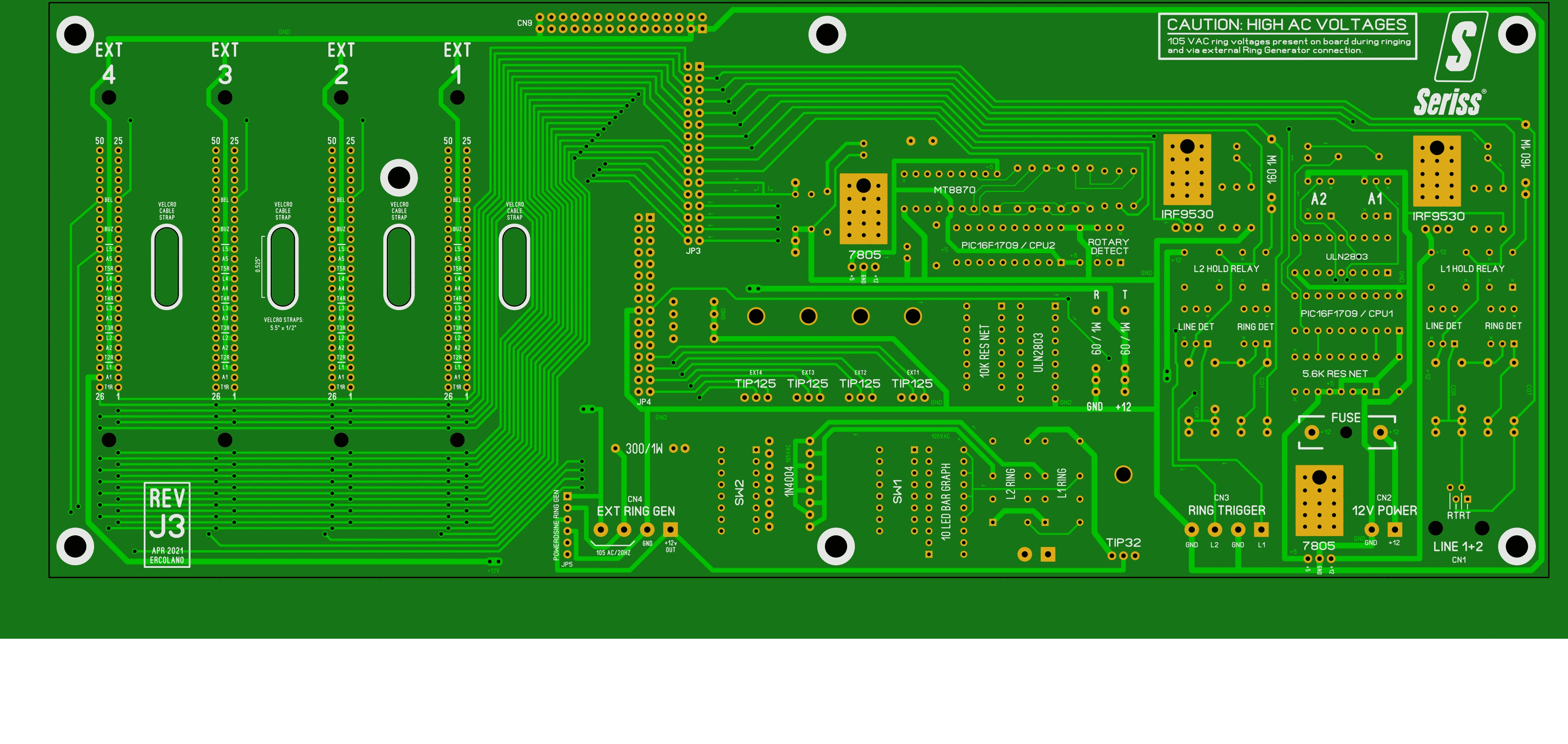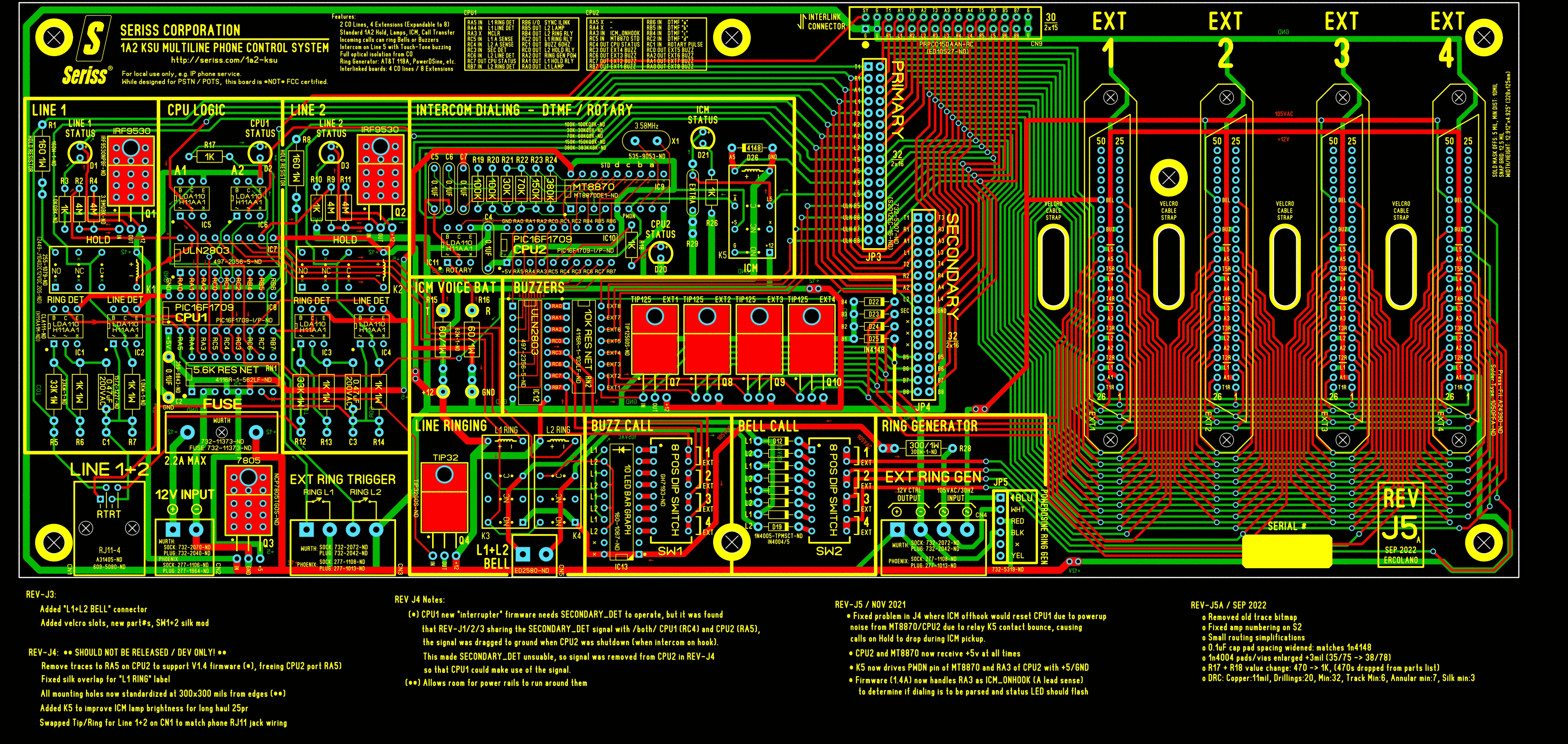 My project with these circuit boards picks up where the telco industry left off, to give those old 1A2 key phones a few more generations of use; it "miniaturizes" the functions of the KSU control into a single circuit board, making it easier to quickly create a small phone system of up to 4 of these phones, such as for use in small office environment, or to demo the old phones easily. 8 phones can be supported by interlinking two of these boards.