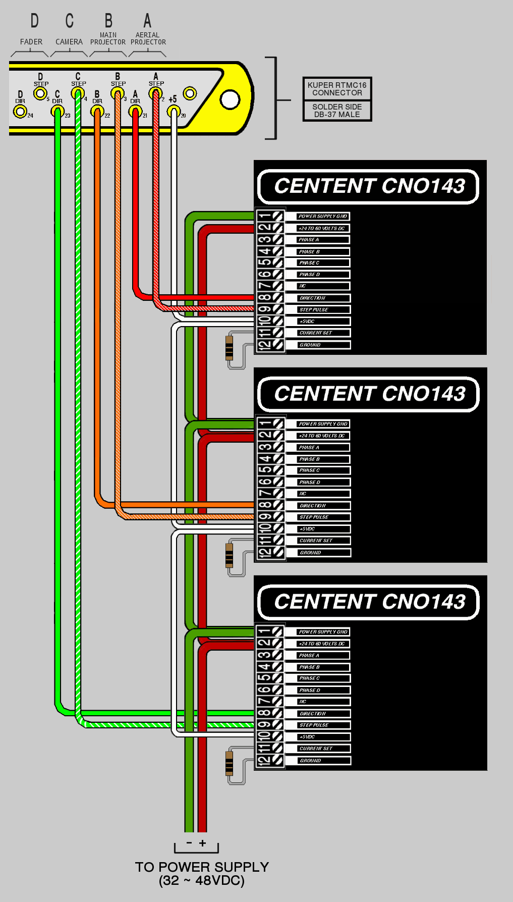 This shows wiring of the male Kuper RTMC16 DB37 connector to three Centent CNO143 drives. Wiring to motors not shown here; refer to the Centent documentation for motor wiring diagrams and the "current set" resistor values.