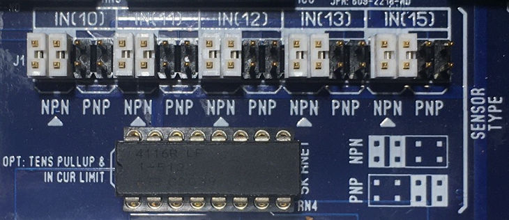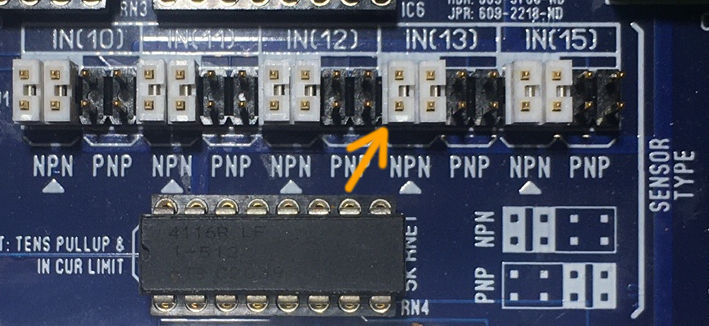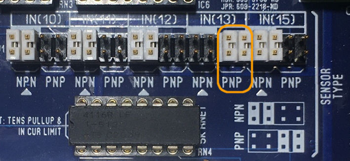 The factory default for all inputs is NPN. For PNP sensors, you have to change the corresponding J1 jumpers from the NPN to PNP position. For example, to configure IN(13) to be PNP, you would first turn off power, and change the jumpers from the default NPN position:
