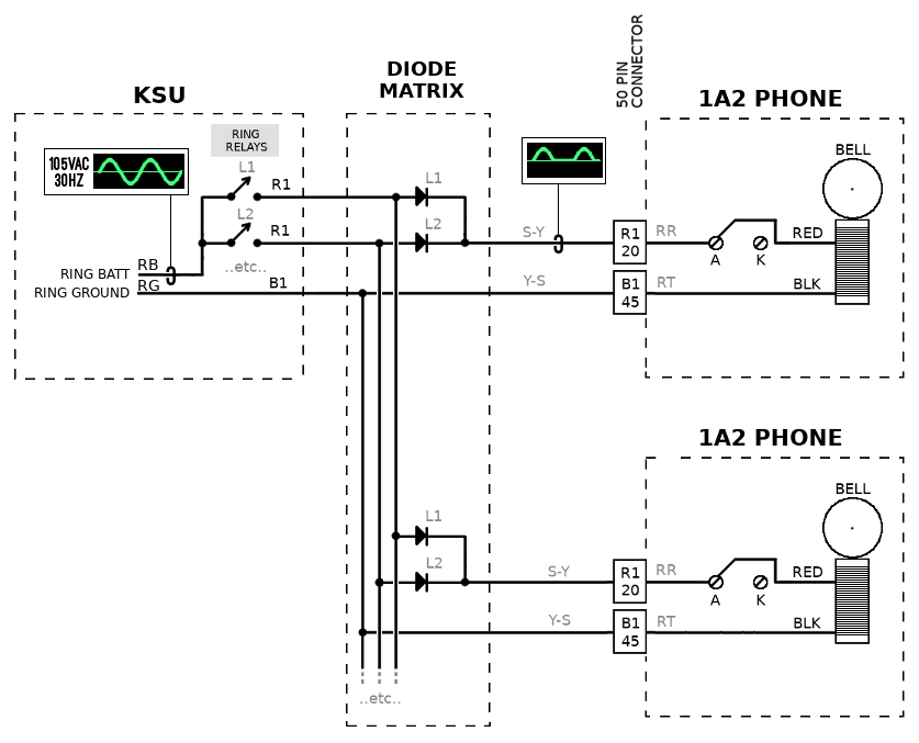 The following diagram shows how diode controlled ringing is typically implemented, with all phones shown with the K -> A wiring change. The idea here is to remove a diode to disable ringing for a particular line/extension: