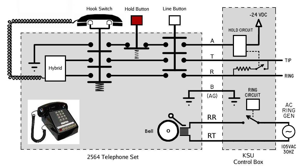 This diagram a simplified view of a typical 1A2 phone system; a single phone line