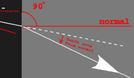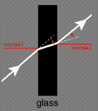 When light leaves a piece of glass, it transitions from high-to-low density (glass-to-air), bending away from the normal: