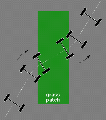 Then, as the leading wheel clears the grass patch, it resumes the normal speed it normally travels on concrete, pivoting the axle around the trailing wheel still in the grass patch. The axle continues to pivot until the other wheel clears the grass, and the axle resumes a trajectory down the hill parallel to its original path, though now somewhat translated to the right.