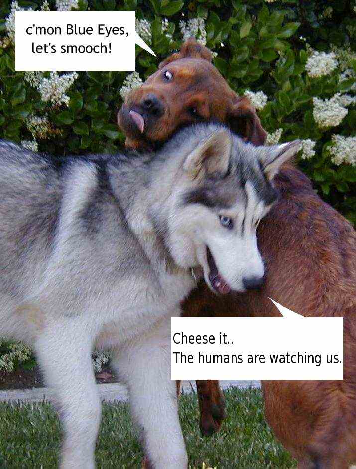 MaggieI call her 'Maglette'; she's a pup. What a ball of energy. Jezus. She's fulla slobbering kisses and love nips. She has feet like a wolf, and sharp little teeth. Her best trick is to romp around in the mud from the sprinklers, then pounce on you with those big muddy paws when you're all dressed up for a meeting. She and Dali like to get it on when no one's looking. They love to run and jump, and play all day. |