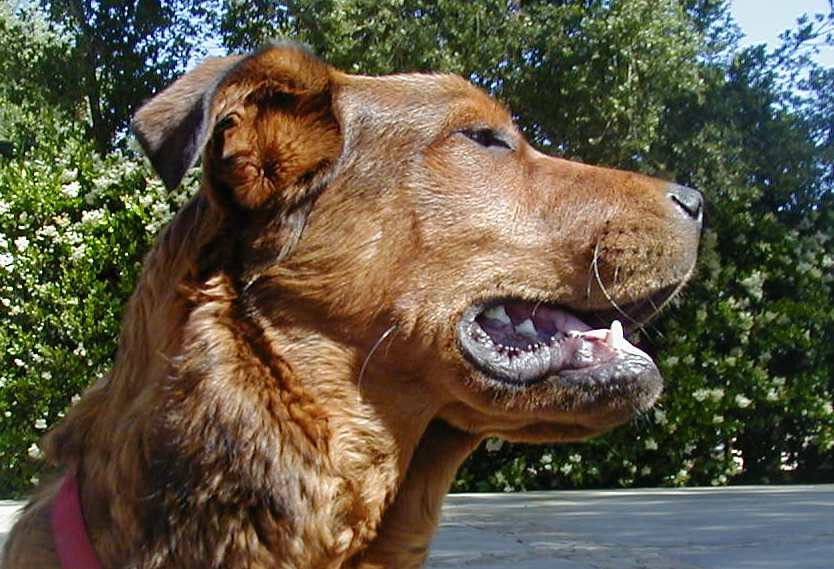IndyA real sweetie.. a nice doggie, the quietest of the bunch, and very polite. She used to chase coyotes all the time, but one day she went a little too far into their territory, and they beat her up pretty bad. I'm surprised she lived through it, after seeing what they did to her. She's less cocky about chasing 'em now. Bingo seems to have taken over coyote chasing. |