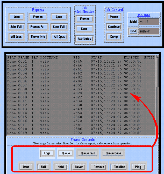 When the screen updates, you will see a frame report for the job. Below that will be a series of 'Frame Control' buttons. By selecting frames from the frame list, you can use these buttons to change the frames selected.