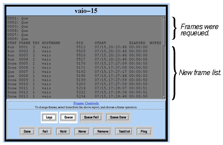 When the screen updates, it will show the output of the Queue operation, followed by a new frame report. Again, frame control buttons will appear at the bottom of the text window, letting you select more frames to be changed.