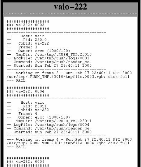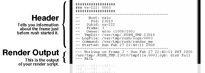 Rush prints a header into the log file, indicating all the information relevant to that frame. Below the header is the output of your render script.