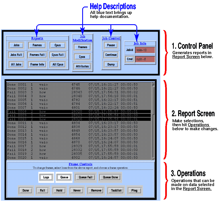 When you first connect to the www-rush server page, you see a panel containing several sub-panels of buttons. Pressing these buttons will let you view reports and otherwise control your job.