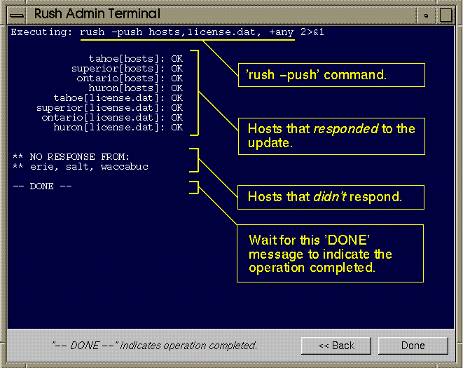 When you hit 'Send', you will see the output of the 'rush -push' operation, which will show the progress of updating each file to each machine on the network. Machines that don't respond will be shown at the bottom of the report, and must be updated again at a later time. eg: