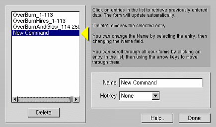 The following window opens, showing a list of your previously saved forms, your new entry highlighted at the bottom of the list as 'New Command'.