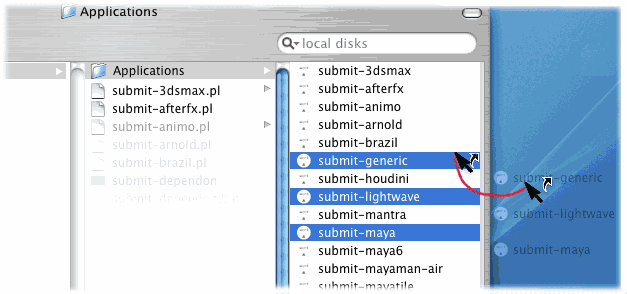 cd /Users/fred/Desktop ln -s //yourserver/jobs/rushscripts/perl/Applications/submit-maya.app . ln -s //yourserver/jobs/rushscripts/perl/Applications/submit-nuke.app . [..etc..]..or you can highlight the submit scripts you need from the Finder, hold down ALT + APPLE keys while dragging them to your Desktop, eg: